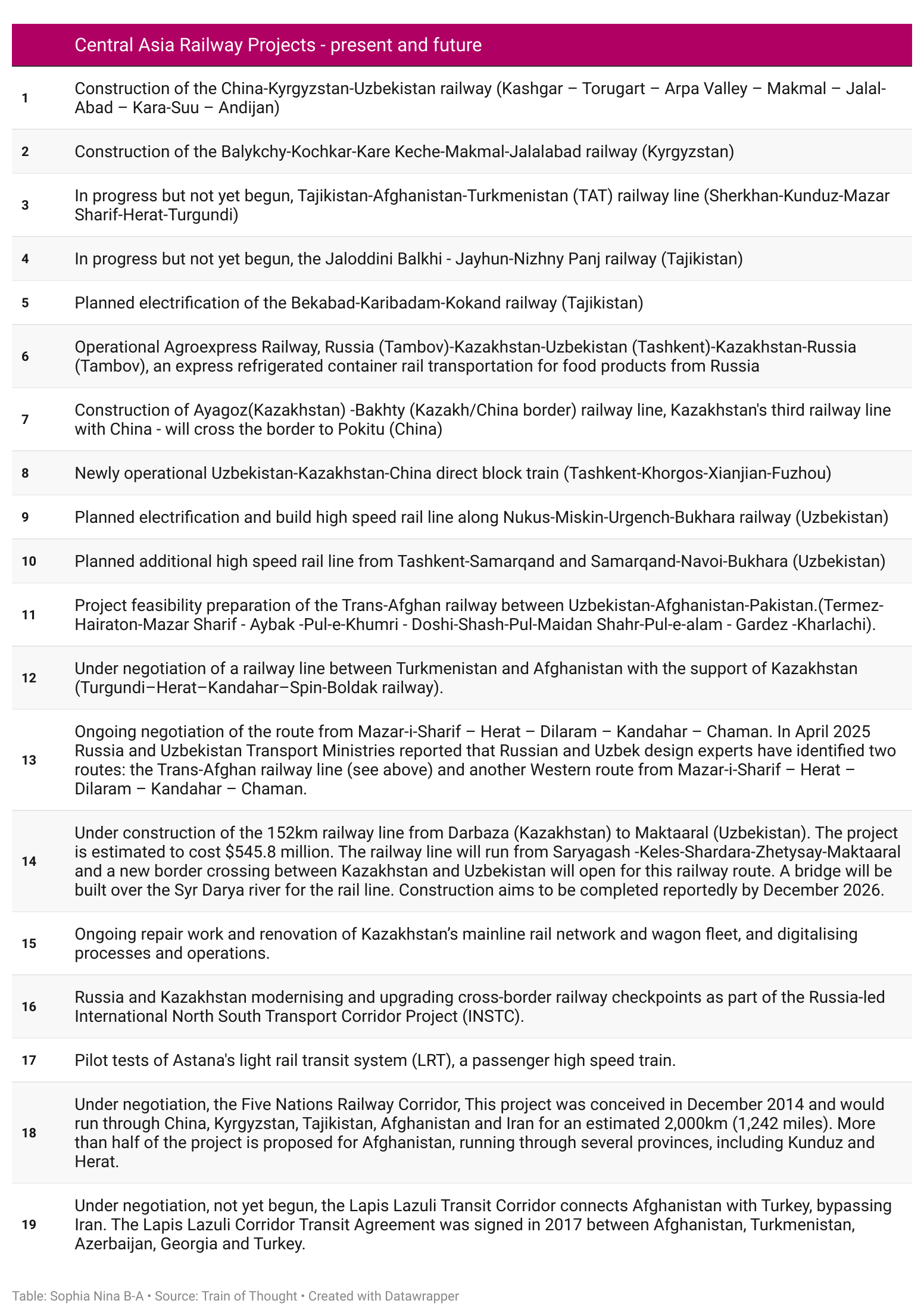 I have just updated and simplified the previous table I published here on Central Asia railway projects. I felt a refresh was necessary! Hope this is clearer and easier to follow.